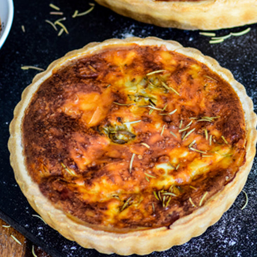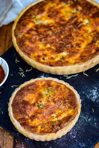 One of the best French savory, filled with egg-based custard and chunks of vegetable, topped with cheddar cheese. Come is an individual serving of tart size or size to share with everyone.